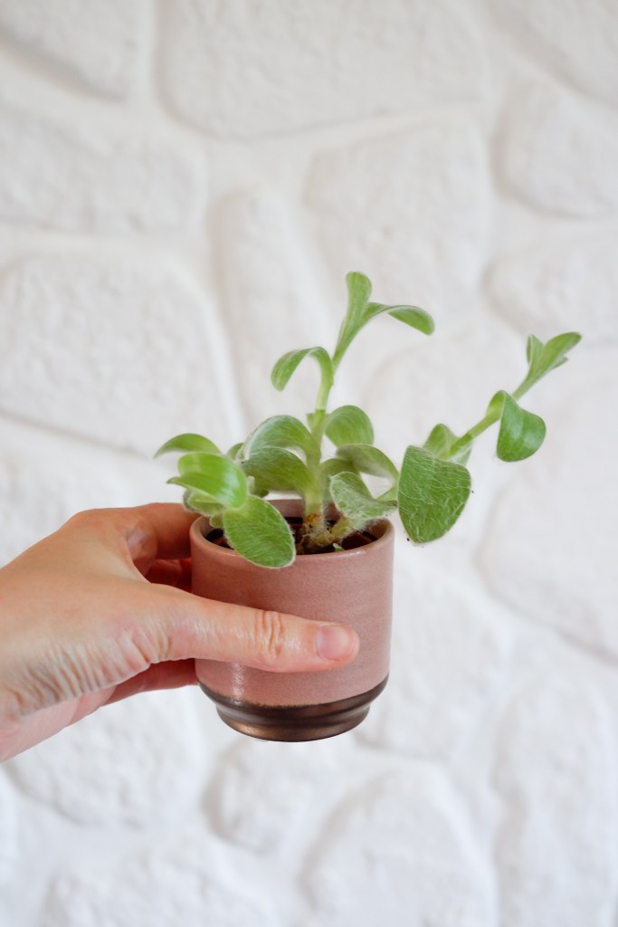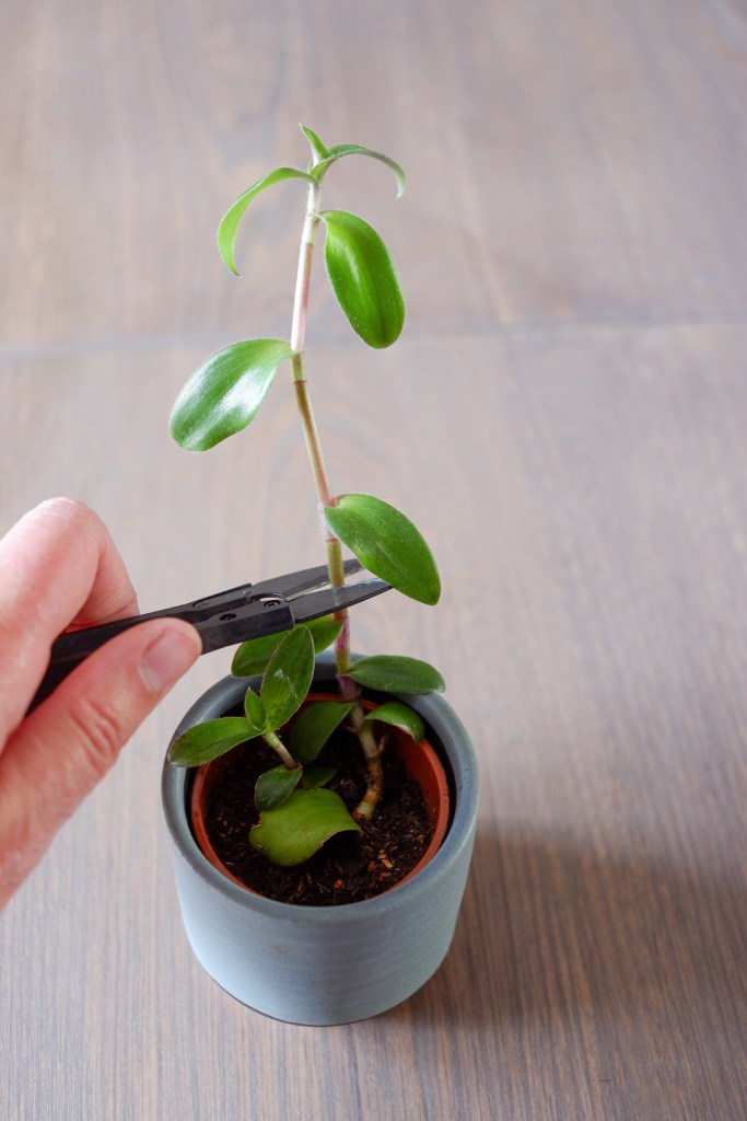 J’ai donc séparé une tige en petits morceaux, en coupant entre les nœuds et en ne gardant qu’une feuille à chaque fois. J’ai ensuite planté chaque bout de tige avec le nœud dans du terreau, en ne laissant que la feuille dépasser. Et j’ai fait en sorte que le terreau reste humide le temps que les tiges fassent des racines (en laissant un peu d’eau stagner dans le cache pot).