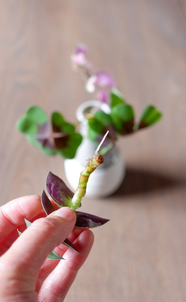 Pour certaines plantes il n’y a pas de nœuds sous lesquels couper, il suffira de mettre une tige dans l’eau pour la faire bouturer (par exemple une tige d’oxalis).